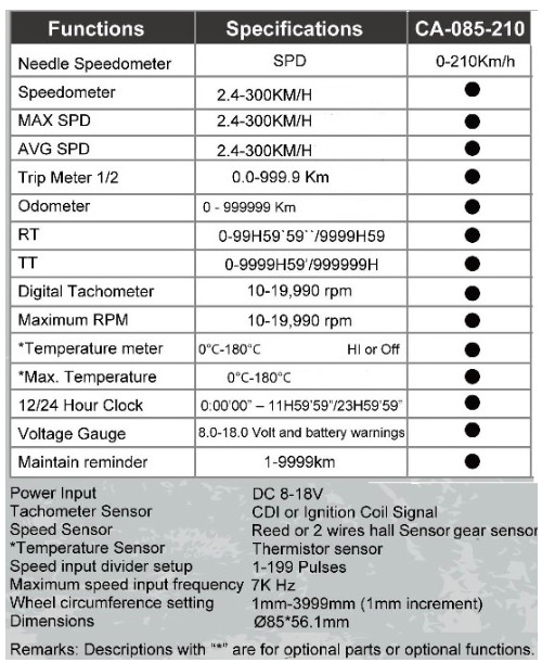 Le compteur CA085 est doté de diverses fonctions, dont l'affichage numérique des données suivantes : vitesse, vitesse moyenne, voltmètre, horloge, compteur kilométrique et kilométrage total. De plus, ce compteur possède des témoins lumineux pour les fonctions suivantes :