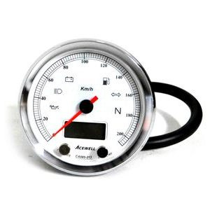 Indicateur de vitesse très complet de Acewell. Il possède une lunette chromée et un cadran blanc. De plus, il possède aussi les fonctions compteur kilométrique et compte-tours. Le compte-tours est analogique et le compteur kilométrique est numérique.