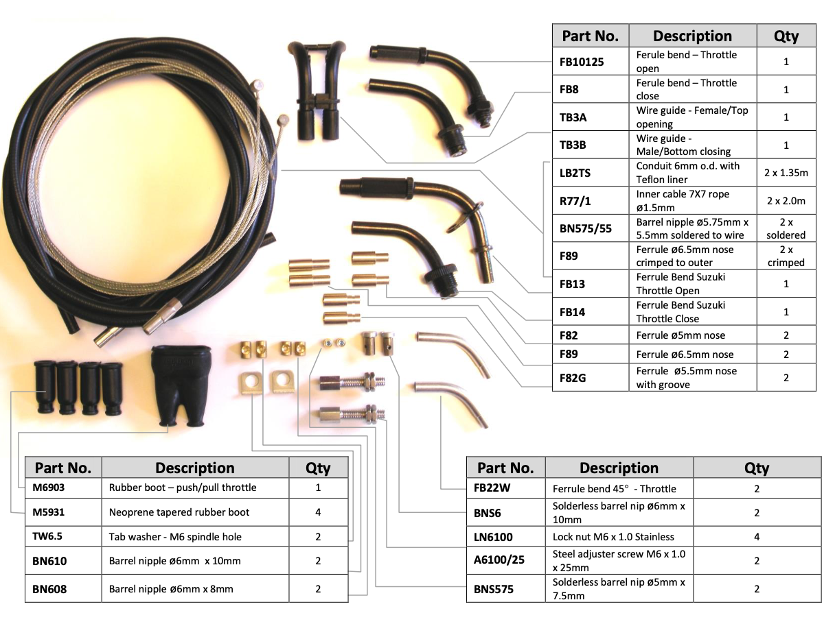 Le kit comprend 2 x 1,35M de conduit noir standard avec revêtement en téflon, 2 x 2M de fil intérieur et une sélection de raccords. Une extrémité des deux fils intérieurs est équipée d'un raccord de 6 mm de diamètre extérieur x 5 mm (BN575/55). Les autres extrémités devront être coupées à la longueur voulue et les mamelons nécessaires soudés en place. Les embouts et les dispositifs de réglage sont bien ajustés sur le conduit. Ils peuvent être collés en place pendant l'assemblage ou utiliser un poinçon central pour faire une petite entaille sur leur côté. Les raccords peuvent être adaptés à une gamme de modèles. Un kit de soudure de base est nécessaire pour souder les embouts en place. D'autres raccords / composants de rechange peuvent être commandés séparément.