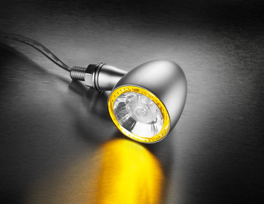 Le Bullet 1000® a été créé avec un objectif précis : un feu clignotant au look classique et au design classe de chez Kellermann, mais équipé de la technologie LED moderne. Une technologie d'éclairage récemment développée (Kellermann-HPT®) crée un anneau de lumière homogène. La qualité de la conception n’est pas seulement dans la forme et de surface, mais également dans l’aspect complet du produit lorsque les lumières sont allumées. Le boîtier métallique de haute qualité possède un diamètre maximum de 39 mm. On dirait presque qu'il s'agit d'un bijou sur votre moto. Il est disponible en version chromée, noire et chrome mat. Le Bullet 1000® fonctionne avec n'importe quel style de moto. Le Bullet 1000® est disponible en quatre versions techniques : clignotant extrême, clignotant avec feu de position jaune, clignotant avec feu de position blanc et clignotant avec feu de position arrière et de stop.