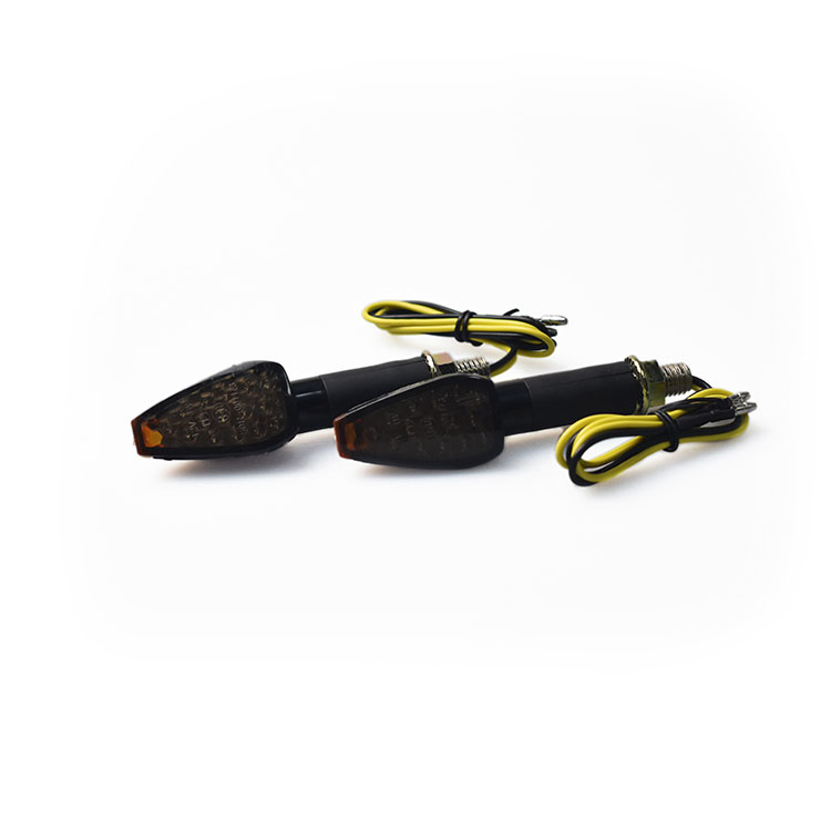 Clignotant LED avec un boîtier noir, lentille fumée et jaune à l'extrémité du boîtier.