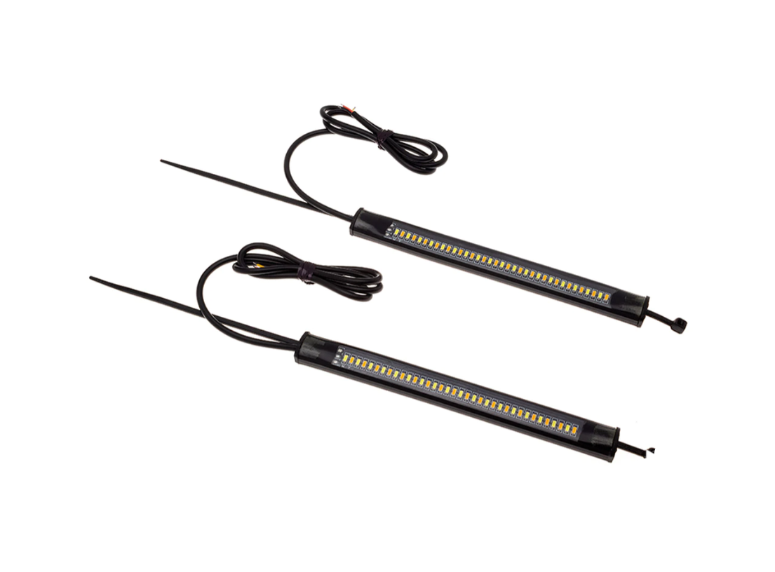 Ces clignotants à DEL intégrés combinent les fonctions de clignotant et de feux de jour nécessaires à l'avant de votre moto. Les LED changent de couleur entre les fonctions - LED orange pour les clignotants et blanche pour les feux de jour. Ils s'enroulent simplement autour de vos fourches et sont fixés en place à l'aide des attaches zippées intégrées.