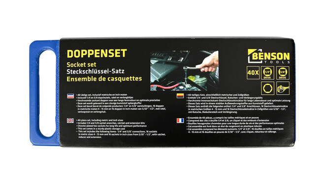 Idéal pour les réparations automobiles, l'entretien de la maison et les travaux mécaniques, le jeu de douilles 40 pièces de Benson Tools est un ajout essentiel à toute boîte à outils.