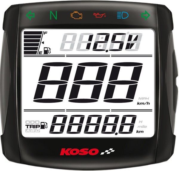 Ce compte-tours homologué est parfait pour les quads, les motos et les scooters. Désormais, les compte-tours Koso sont équipés de fonctions telles la possibilité de changer l'affichage km/h en MPH et/ou de s'adapter à la circonférence de vos pneus. Trois supports additionnels sont disponibles en option afin d'attacher facilement cet instrument à votre véhicule.