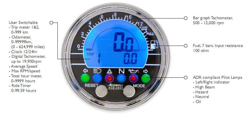L'indicateur de vitesse Acewell 2853 AS possède un boîtier noir et une lunette en aluminium chromé. Cet indicateur de vitesse numérique Acewell ACE-2853 est approuvé par la norme ADR pour les motos et les véhicules de transport de passagers en Australie et en Nouvelle-Zélande. Il est possible d'encastrer le ACE-2853, ce qui le rend très populaire pour les constructeurs de motos personnalisées.