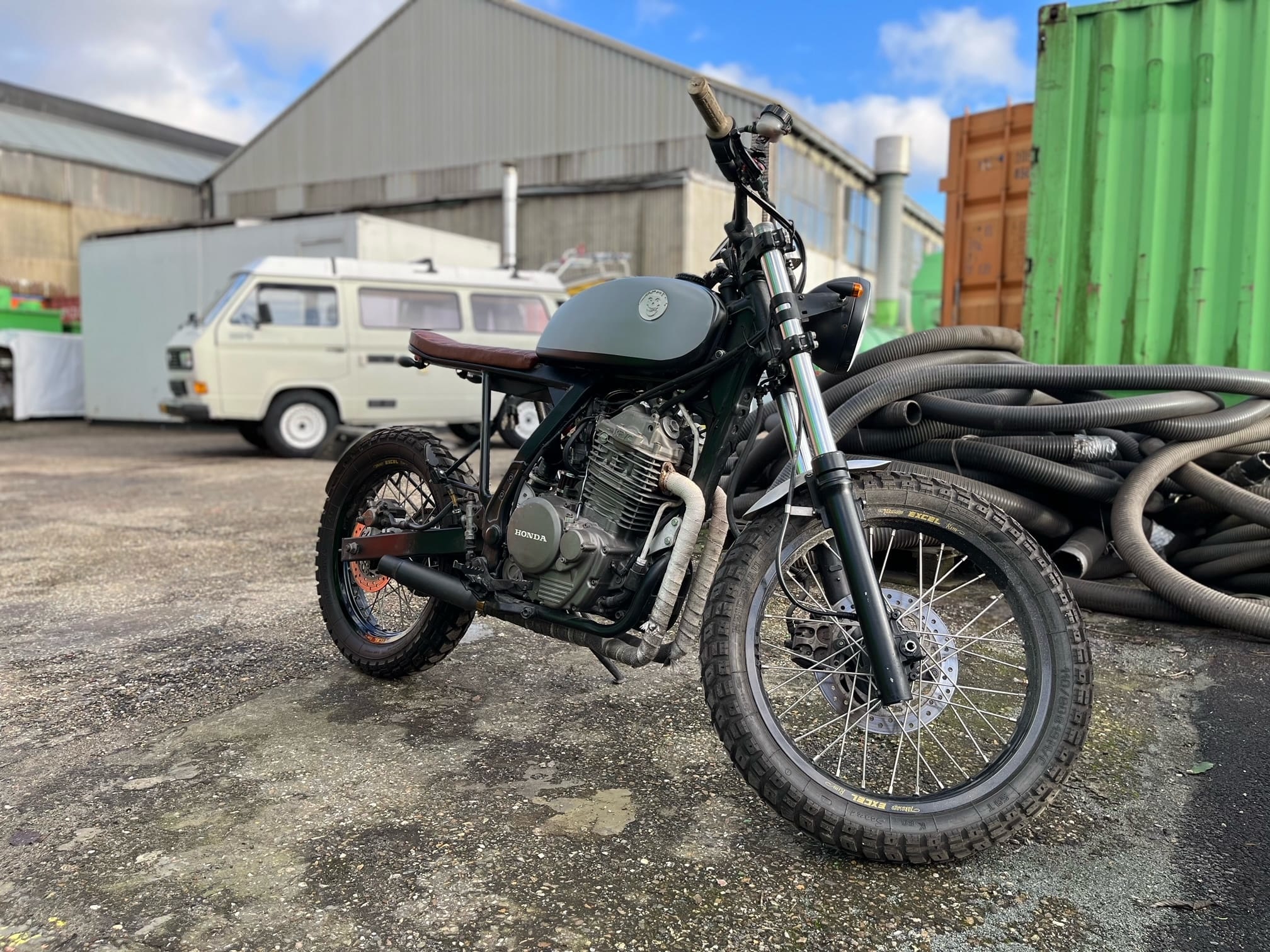 Proposé à la vente pour cause d'utilisation insuffisante : mon scrambler Honda NX650 dominator. Auto-construit en 2015.