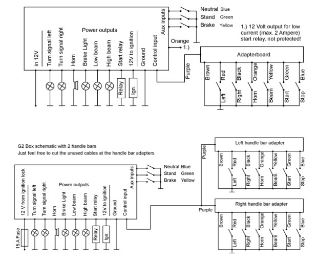 La G-Box est disponible avec un adaptateur de guidon (G) ou avec deux adaptateurs de guidon (G2). Il contrôle les principales fonctions électriques avec des boutons-poussoirs.
