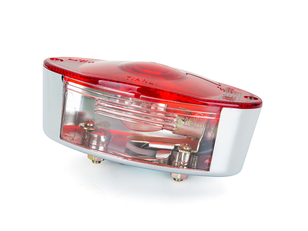 Feu stop / arrière ovale marqué E chromé / noir. Feu arrière personnalisé de haute qualité avec un support universel. Ce feu arrière a également un feu stop et fonctionne sur 12 volts. Le boîtier est en ABS et nous les fournissons en chrome ou noir.