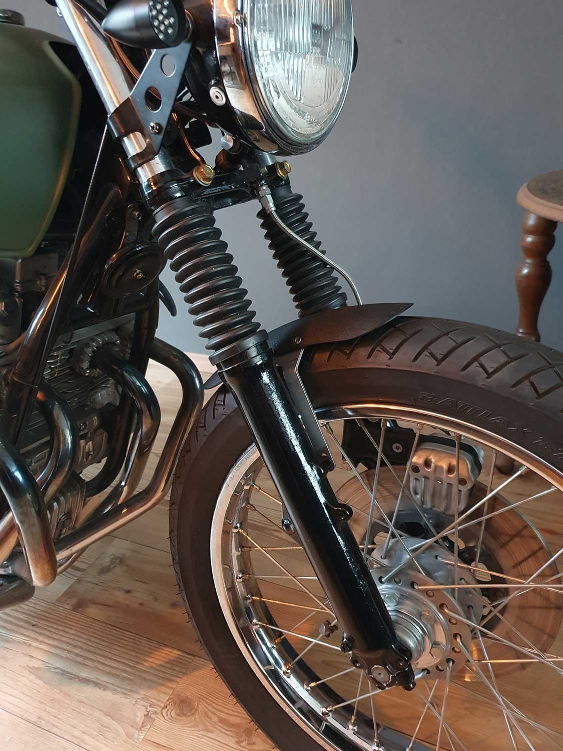 Ces garde-boue avant magnifiquement finis sont spécialement conçus pour les Honda FOUR CB500, 550, 750. Les garde-boue noirs sont très soignés grâce à la finition texturée. Les supports sont en acier inoxydable de 3 mm et peuvent être peints en couleur si vous le souhaitez. Comme les supports ont un trou fendu, le garde-boue est réglable en hauteur.