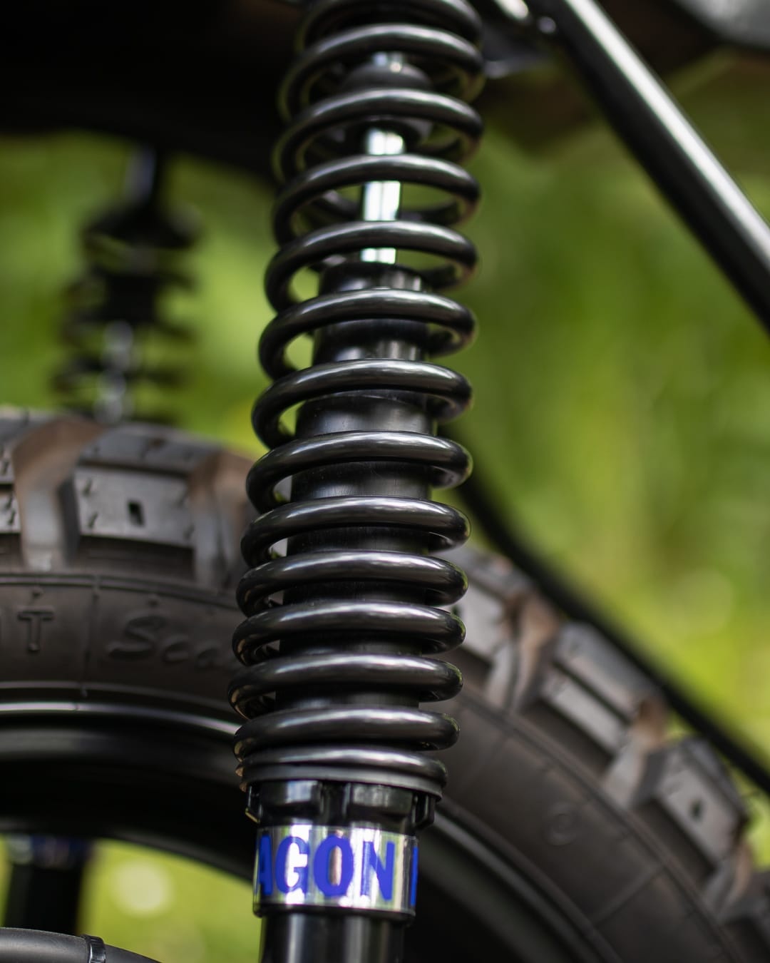 - éclairage : phare LED café racer 7'', feu arrière LED dans la selle, indicateur de fumée en bout de guidon Koso et feux arrières LED.