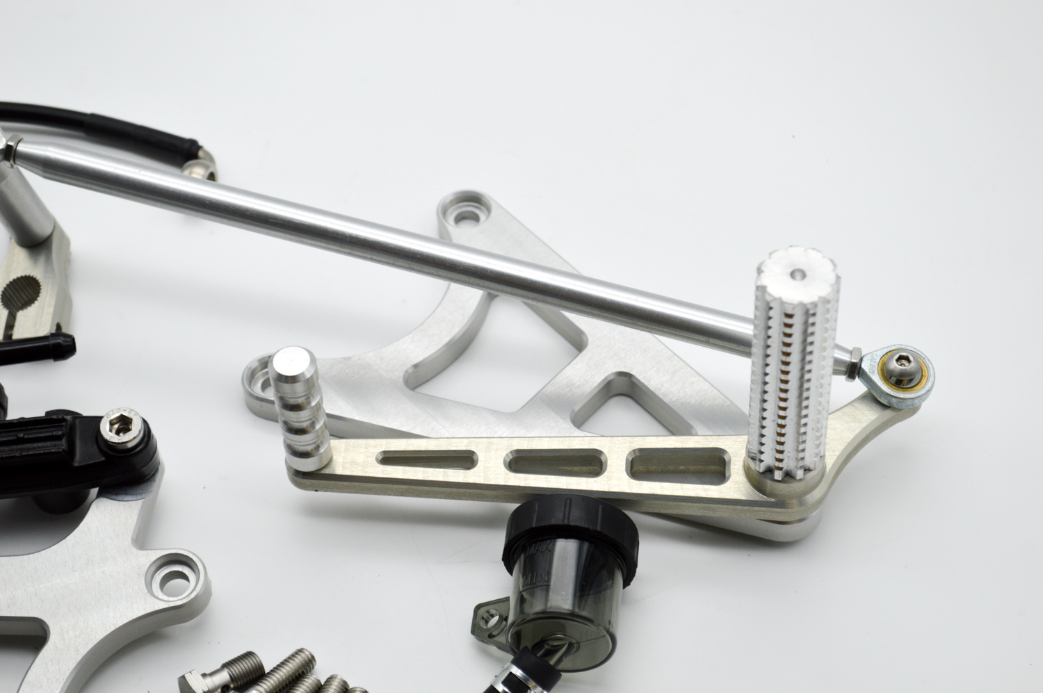 - CNC milled brake and gear lever with a sliding sleeve.