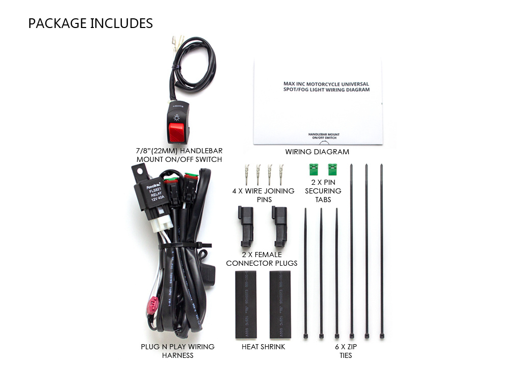 Ce kit de câblage complet de haute qualité a été spécialement conçu pour les motos. Comprend un interrupteur à bascule ON / OFF sur le guidon, un relais, un fusible étanche et des connecteurs de fils à monter soi-même. Ce kit contient tout ce dont vous avez besoin pour installer directement sur votre moto avec un minimum de compétences techniques. Tout a été pensé dans cette conception du début à la fin et est essentiellement Plug n Play. Ce kit non-intrusif fonctionne de manière totalement séparée du faisceau de câbles de votre moto. Il est donc à l'abri de toute panne électrique sans être gênant. Deux fils se connectent directement à votre batterie et un fil est relié au fil positif du feu de stationnement en utilisant un connecteur à pince. Le kit est livré avec des connecteurs DIY étanches pouvant être connectés à vos phares auxiliaires.