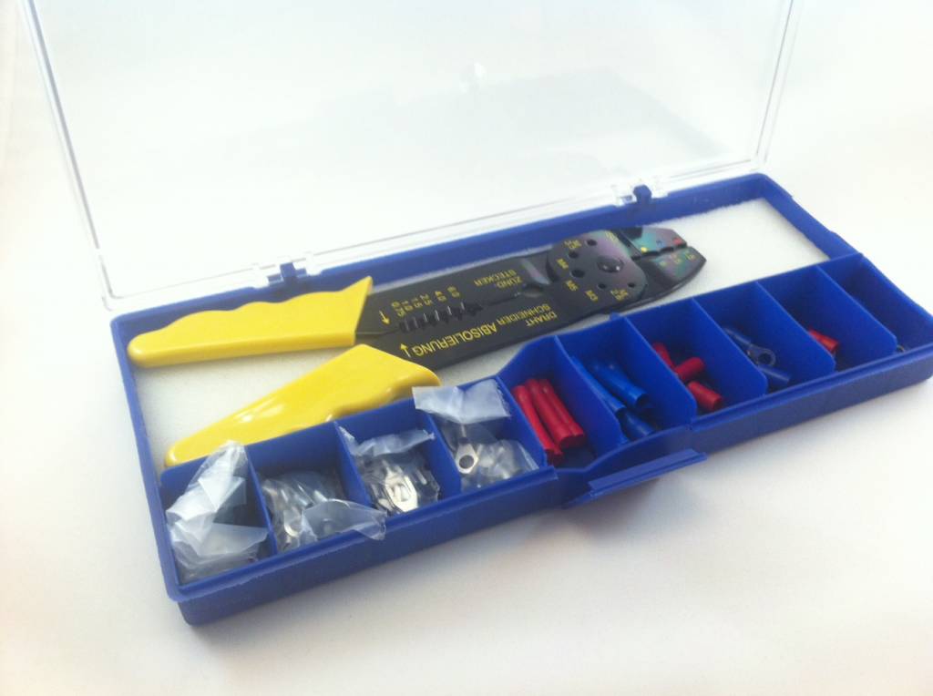 Kit de cosses avec pince. Cosses isolées et non isolées (bleues et rouges). Pince à sertir pour dénuder et couper des câbles de 0,75 à 6,0 mm². Le kit est livré dans une boîte de rangement pratique.