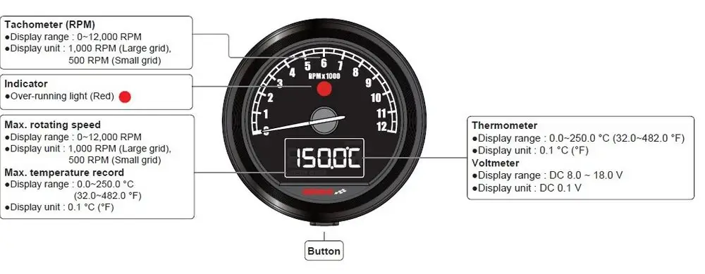 - Plage d'affichage : 0 ~ 12,000 RPM