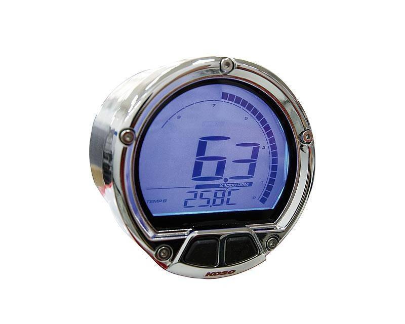 Ce compteur affiche jusqu'à 20.000 tours/minutes et possède un thermomètre intégré. Fonctionne très bien en combinaison avec l'indicateur de vitesse 55 mm.