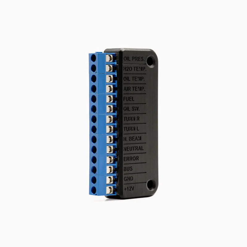 Bornes d'entrée pour carburant/réserve, pressostat d'huile, clignotants gauche et droit, feux de route, point mort, voyant d'avertissement du moteur, température d'huile, température de l'eau, température ambiante et pression d'huile.