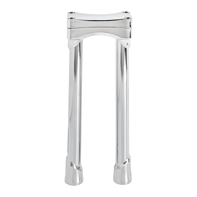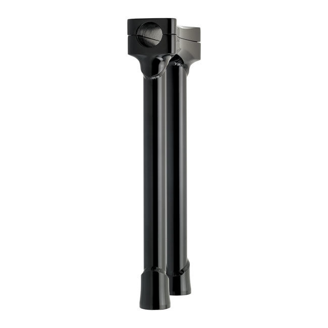Chromé et noir. Approuvé par le TUV. Pour guidon 1-1/8 (28,6 mm). La partie supérieure et la partie inférieure sont en acier moulé à chaud. Les tubes des élévateurs sont en chromoly 4130 sans soudure, soudés par TIG, avec des tubes de 3 mm d'épaisseur et des trous de montage filetés 1/2-13 qui acceptent les boulons d'élévateurs d'origine. L'espacement est de 3-1/2" (89mm), pour s'adapter à la plupart des arbres triples supérieurs H-D. Le modèle de boulons de la pince supérieure permet d'utiliser les supports de compteur et de tachymètre H-D d'origine.