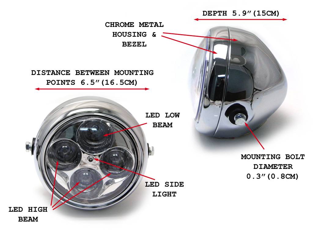 Ce phare avant se monte latéralement, il peut donc être facilement monté sur des colliers de fourche. De plus, il est très facile à brancher à vos connexions existantes. Étant donné qu'il s'agit d'un phare à LED, les ampoules sont très lumineuses et aveuglantes lorsque vous utilisez la fonction feu de route. De plus, ce phare avant possède une fonction phare latéral / feu de position.