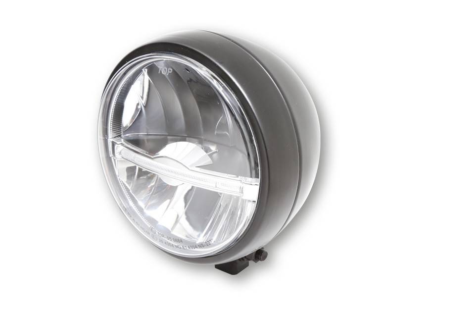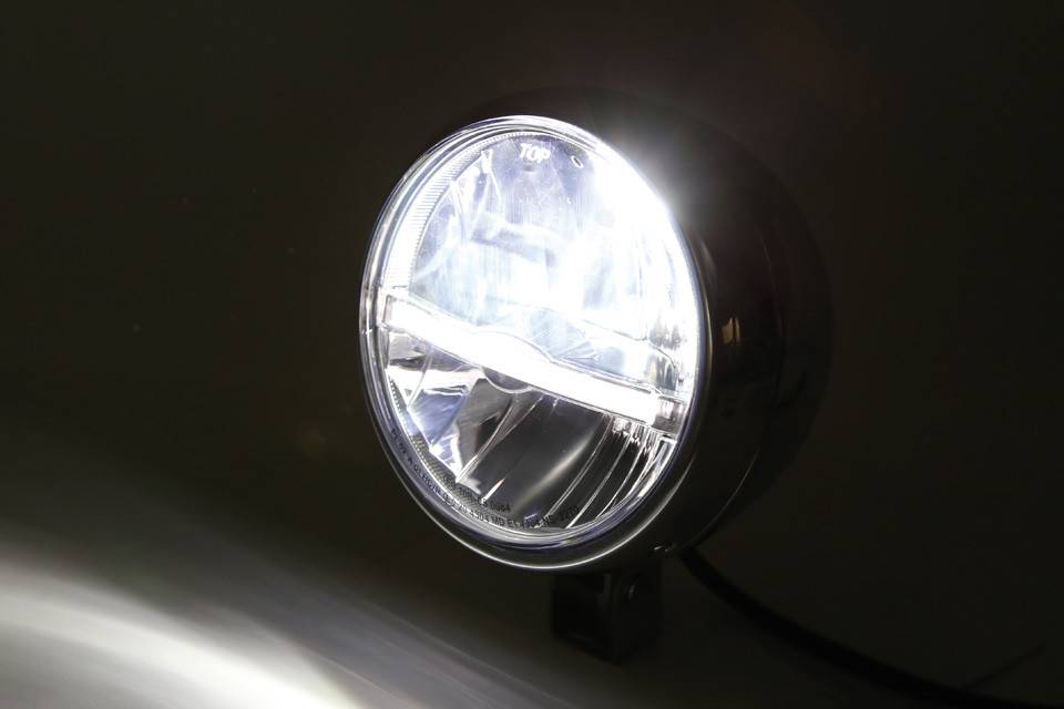 Phare rond avec fonction feu de route et feu de croisement. Boîtier avec réflecteur inclus (tous deux chromés) et lentille transparente. Le montage s'effectue par le bas. L'éclairage LED du phare avant se situe au centre de l'insert sous forme de bande lumineuse (système de guidage de la lumière). Le phare est équipé d'un réflecteur asymétrique qui est approuvé uniquement pour la conduite à droite. Ce produit est homologué pour l'Union européenne.