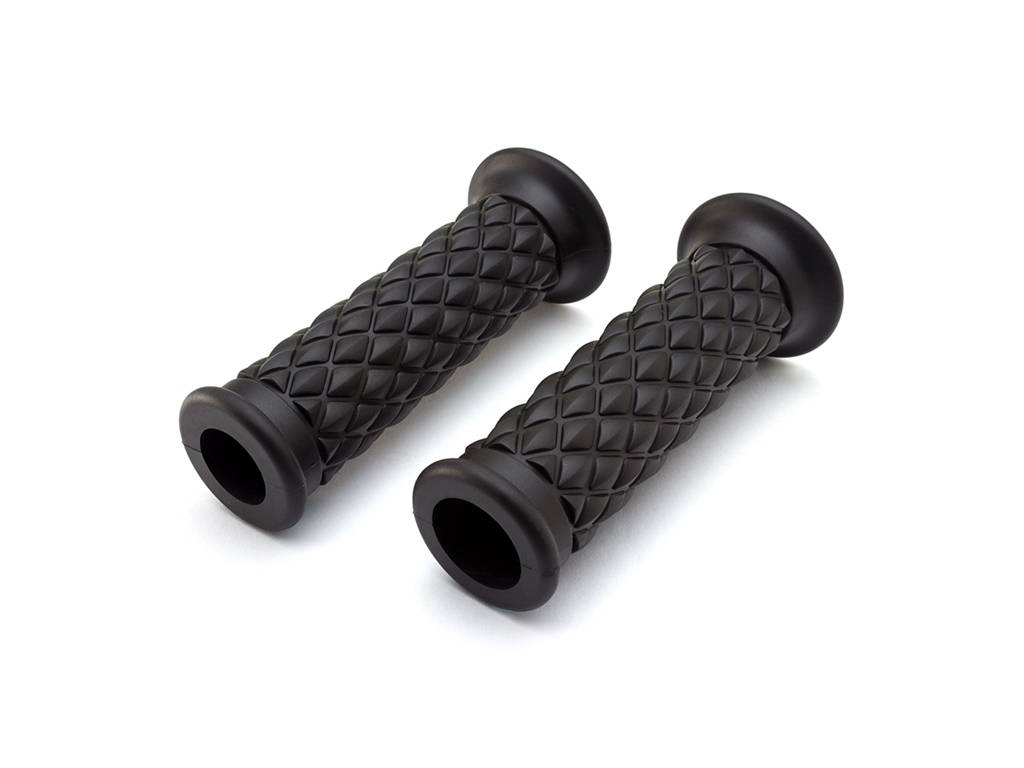 Poignées noirs style "Café Racer Diamond". Ces poignées universelles au style classique are confortables et résistantes. Les extrémités sont ouvertes afin de permettre le montage aux extrémités du guidon (pour des rétroviseurs, par exemple). Parfaites pour les motos personnalisées, Scrambler, Café Racer, etc.