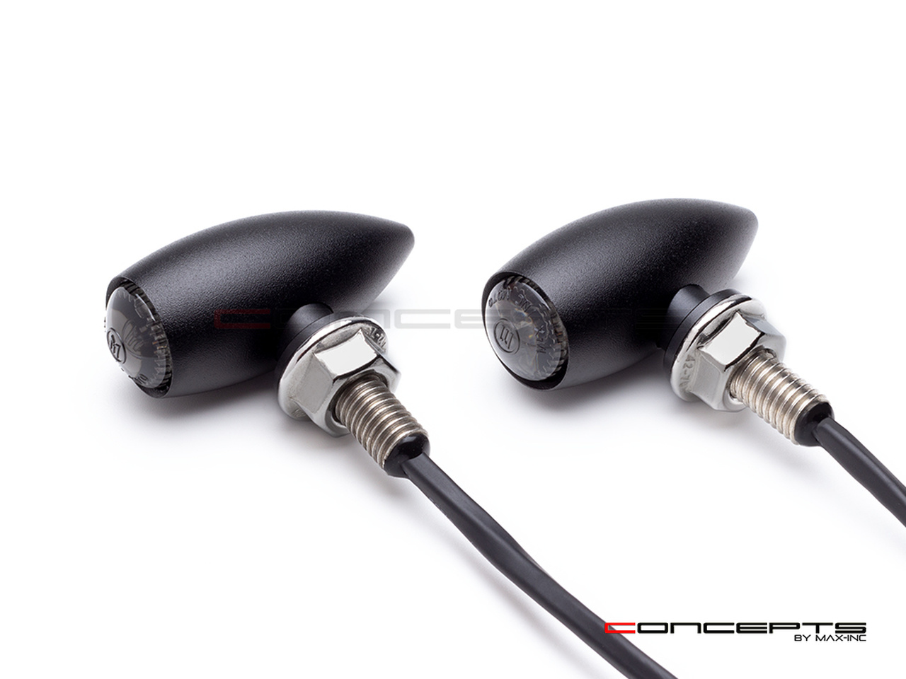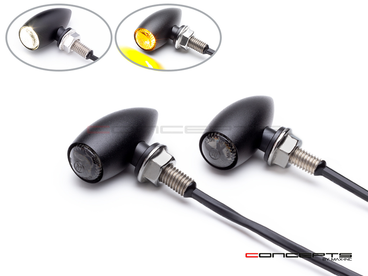 Ces clignotants à LED intégrés sont usinés CNC, super brillants et super petits. Ils combinent toutes les fonctions nécessaires à l'avant de votre moto dans un minuscule boîtier tout-en-un. Ils sont équipés d'une puce LED bicolore super lumineuse recouverte d'une lentille de projecteur qui amplifie la lumière. La LED bicolore change de couleur entre les fonctions - LED ambre pour les clignotants et LED blanche pour les feux de circulation de jour. Ces clignotants intégrés sont notre conception exclusive et ne sont disponibles que directement par Max Inc et nos revendeurs sélectionnés.