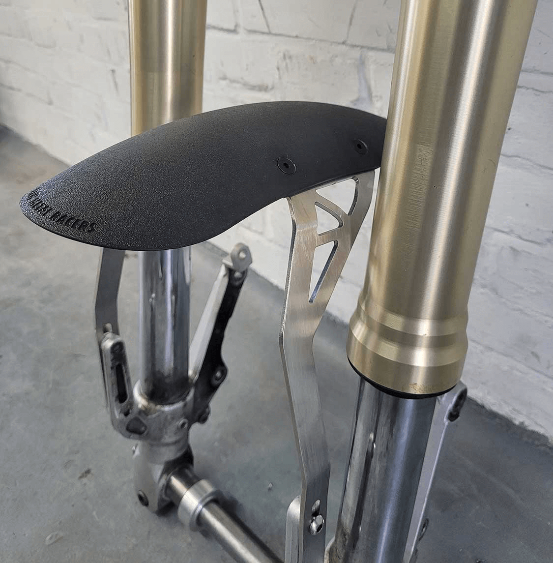 Ces garde-boue avant magnifiquement finis sont spécialement conçus pour les motos personnalisées avec une conversion de fourche Yamaha YZF R1. Les garde-boue noirs sont très soignés grâce à la finition texturée. Les supports sont en acier inoxydable de 3 mm et peuvent être peints en couleur si vous le souhaitez. Comme les supports ont un trou oblong, le garde-boue est réglable en hauteur.