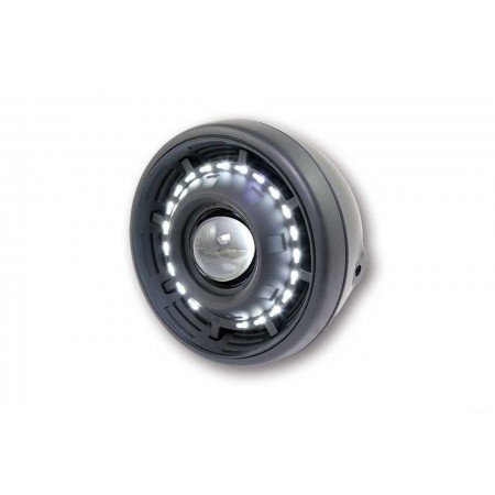 Phare principal avec système de projection innovant et système d'obturateur pour feu de route et feu de croisement. Boîtier noir en métal. Ce phare se monte latéralement (M8). Grâce à son ampoule LED située à l'avant, ce phare donné à votre moto un look nouveau, le tout avec une homologation européenne.