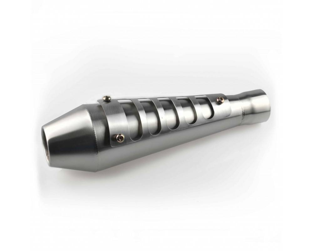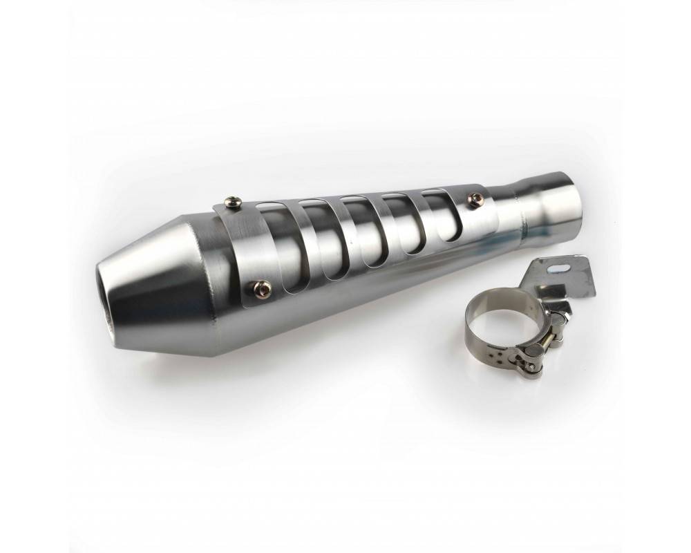 42MM Diamètre interne au raccordement. En acier inoxydable. Il est fait à la main et c'est un vrai Scrambler Damper. Ils sont livrés avec un support et une pince pour le montage. La longueur du silencieux est de 335 mm.