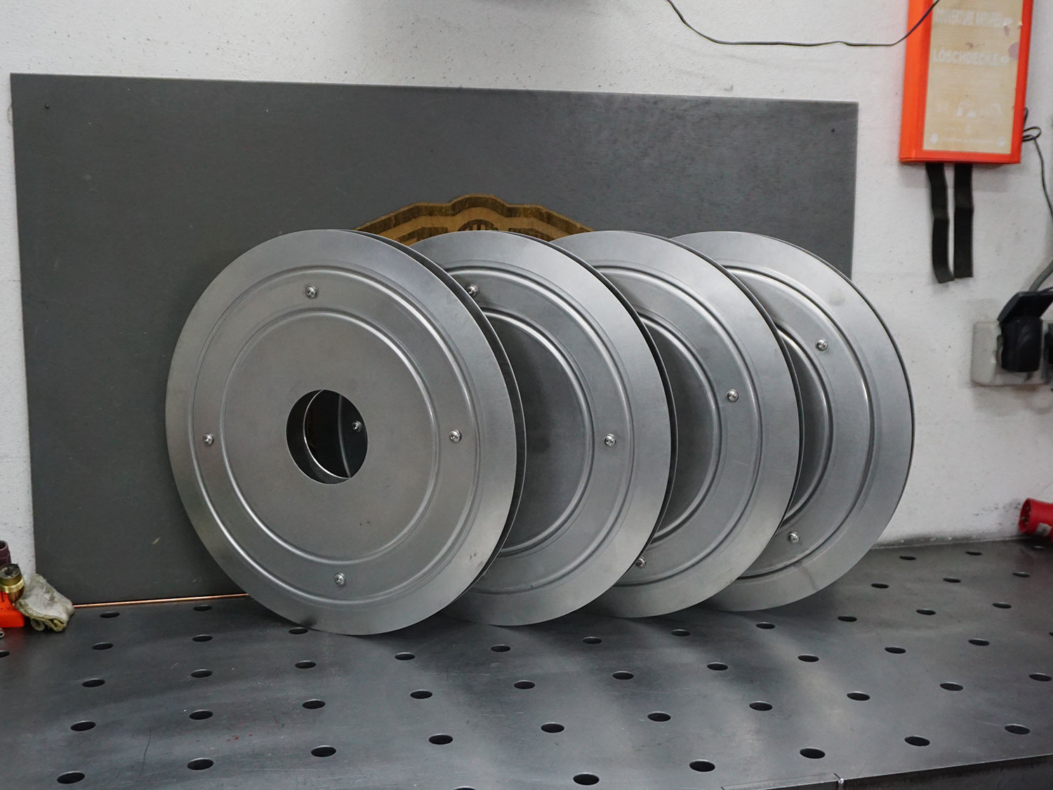 L'ensemble est composé d'aluminium AlMg3 non peint de 1,5 mm d'épaisseur. Vous pouvez les pulvériser/enduire ou les laisser non peints. Assurez-vous de garder les Moondiscs propres, de les mettre dans la cire et d'éviter la saumure.
