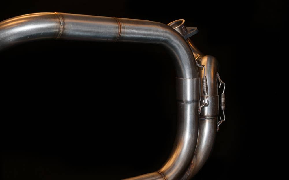 Les échappements sont en RVS. Les tubes ont un diamètre de 45 mm et le silencieux s'adapte sur une bride de 51 mm. L'échappement sera livré sans silencieux.