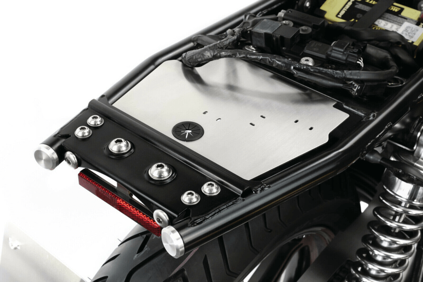 Assembly : d’abord le fender original de votre conversion est supprimé. À l'aide du matériel de montage fourni, le suppresseur de garde-boue Two Hands Motorcycles est réinstallé aux points de montage d'origine.