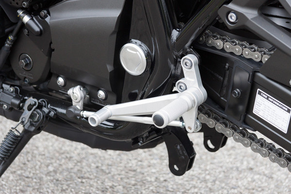 La conception de ces commandes reculées s'inspire de la construction de ponts. En fabriquant chacune des pièces de ce kit avec cela en tête, on obtient des commandes reculées à la fois robustes et légères, tout en étant particulièrement magnifiques. Les repose-pieds et les leviers sont fabriqués à partir d'aluminium d'excellente qualité. Afin d'éviter le jeu de leviers et des roulements, nous utilisons des brosses en PTFE durables. Ces kits de commandes reculées vous offrent donc la possibilité de changer de vitesse avec précision. Même lorsque vous prenez des virages serrés, les repose-pieds repliables vous offrent une sécurité optimale en touchant le sol (en option).