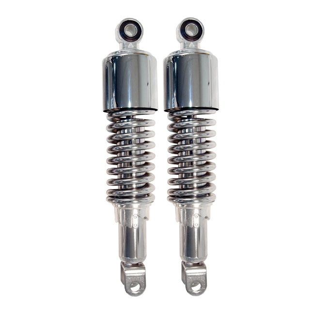 289MM Custom Shorty Shocks Chrome or Black Eye/Clevis. 11.4" (289cm) long from mount to mount. A great way to lower your 70's or 80's Cafe racer or Bobber. The pre-load is 5-stage adjustable with a classic stepped ramp. - 11.4" Eye to clevis eye with short upper shroud. - Upper bushing: 12mm i.d. x 21mm. - Lower mount: Clevis (All clevis have a 10mm x 1.25 threaded hole and are 22mm wide inside).