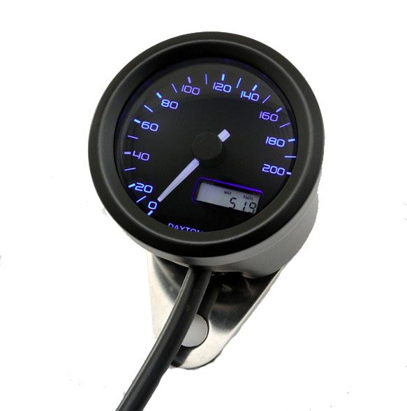 Daytona Velona Speedo Black. DAYTONA digital speedo VELONA, round, d. 48 mm, scale 200 km/h, E-marked, with bracket, white backlight, speedo/voltage/ODO/trip/clock.