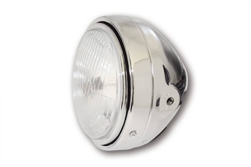 Headlight with parking light and an adjustable inner ring, chrome metal housing, H4 12V 60/55 W, side mount, E-marked. Dimensions: Case diameter: 165 mm, total depth including curved glass: 145 mm, lateral recording M8. Housing depth of mid-side mounting holes to the rear, about 75 mm.
