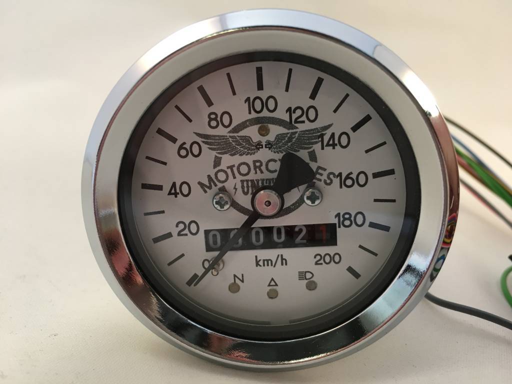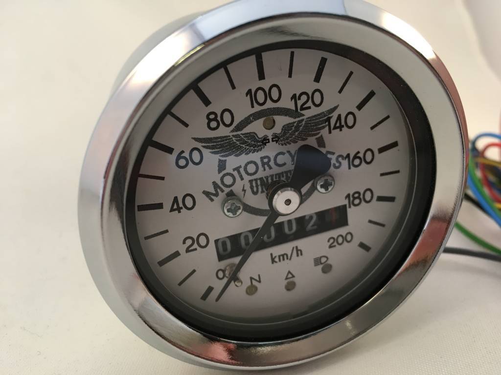 This Chrome with white Speedo has an 18 mm thread and a K-value of 0,7 which makes it a bolt-on for bikes like an R80, etc. So, stop looking for a cool BMW Speedo! You've found it!