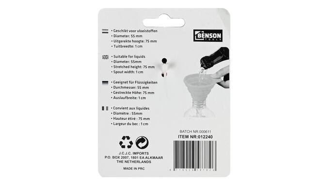 L' imbuto pieghevole in silicone di Benson Tools è uno strumento compatto e versatile progettato per rendere il trasferimento di liquidi facile e senza problemi. Il suo innovativo design pieghevole consente di risparmiare spazio in cucina, garage o officina, rendendolo un'aggiunta comoda e portatile alla tua collezione di utensili.