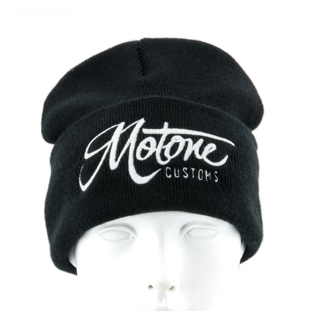 Questo berretto nero è realizzato in maglia a doppio strato 100% acrilico Soft-Touch in nero, con il logo Motone ricamato in bianco sul polsino.