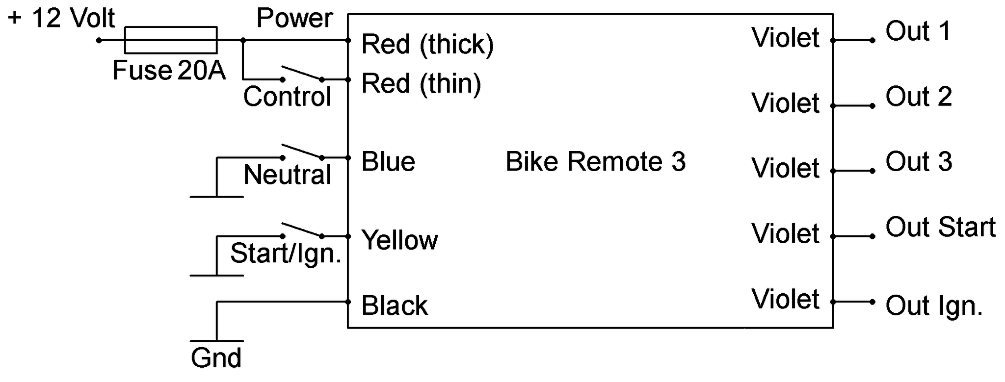 The control power and the switching power are separated in 2 cables that allow the implementation of a small switch in your bike what reduces the standby power of the module down to a few Microampere when your bike is not in use, instead of sucking the battery empty due to the high current consumption of a Bluetooth connection.