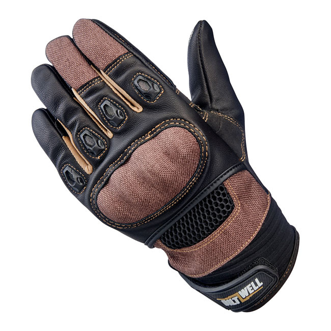 Like other leather/textile hybrids on the sport bike grid, the Biltwell Bridgeport glove features rugged construction and a racy silhouette. Supple goatskin leather, three-ply vented polyester, ballistic nylon, and CE-certified impact- and friction-zone reinforcement makes our most advanced three-season riding glove ready for business. Supple goatskin leather palm, fingertips, thumb, and friction panels. Flexible thermoplastic rubber wrist tab with molded impact protection. Anatomically-shaped synthetic suede palm panel with Lycra flex zone. Comfortable two-way stretch laminated neoprene wrist panel. Ballistic nylon finger, hand, and knuckle guard panels. Conductive stitching in fingers and thumb lets you operate smart screens. Lycra expansion panels in finger joints for added dexterity. Padded high-impact plastic knuckle guard with three-ply vented panel. Silicone traction logo on palm. Molded plastic finger vents. CE certified for recreational highway and off-road riding.