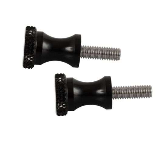 This is the short (28 mm without thread) version which remains the lowest profile look on your motorcycle when fitted. Integrated captive stainless hex head bolt so can be torqued with Allen key when required as well - knurled sides for tool less turning.