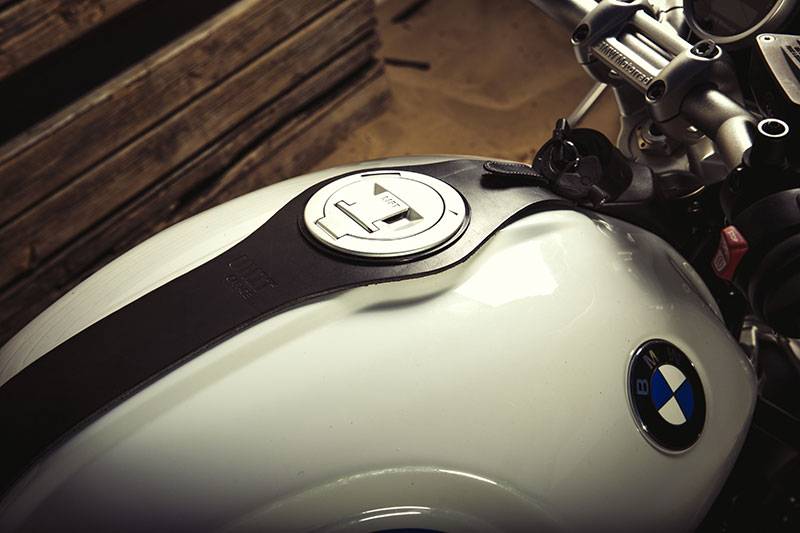 The mounting kit includes a spacer to raise the aluminium gas cap, so in addition to securing the leather strap in the right position (see picture), no one will be able to remove it without the keys of the bike.