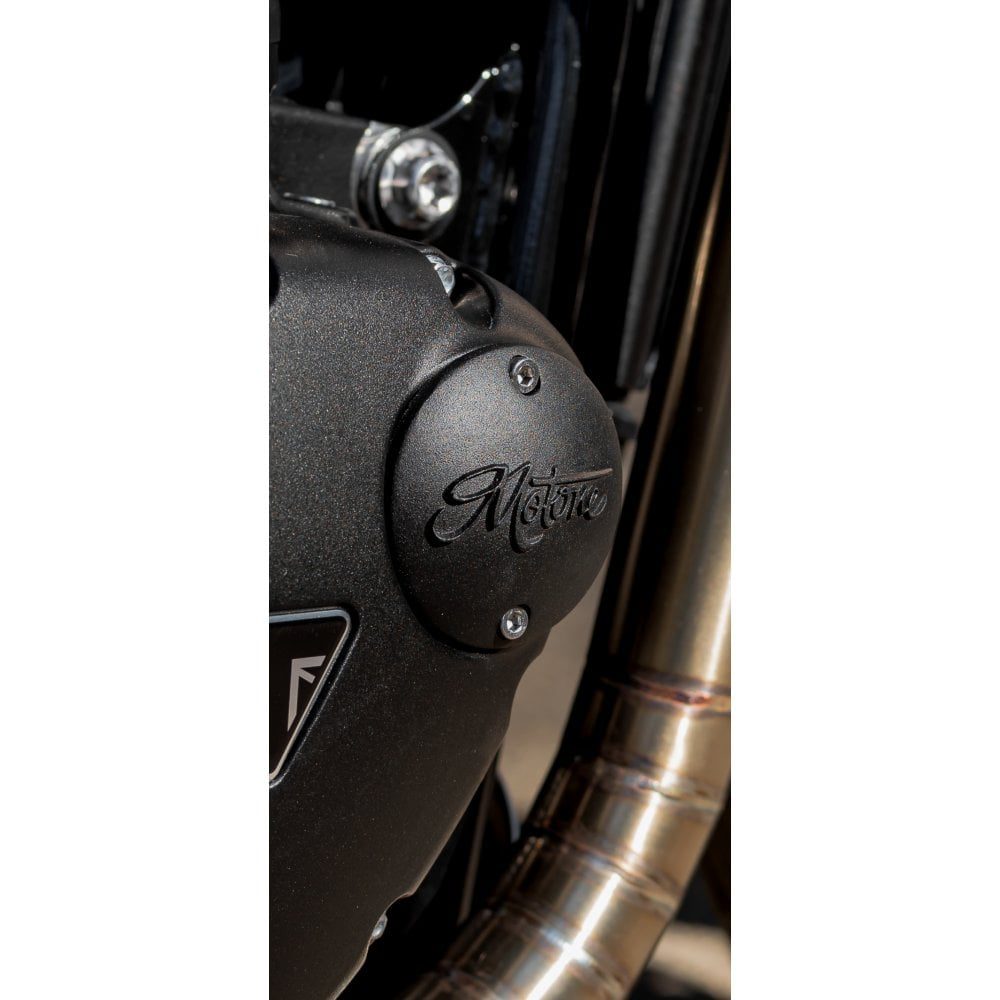 Coperchio/Badge Motone Points ACG con logo MOTONE in rilievo sulla faccia esterna in finitura Wrinkle Black. Questo coperchio è per l'ACG (quello che una volta era noto come coperchio "Points" sulle Triumph Meriden d'epoca), il più piccolo dei due coperchi motore rotondi.