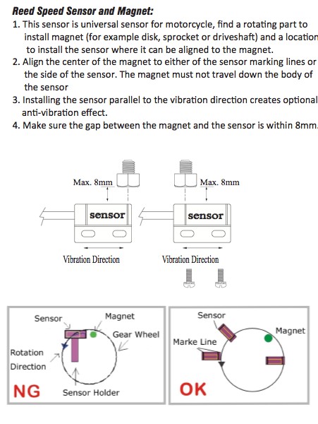 The Acewell speed pickup uses a reed switch and magnet. Both are included in the kit. For bikes, simply replace a bolt in your front disc rotor with the included magnetic bolt, and align the reed switch with the magnet. Then program the tyre circumference into the Acewell. That will calculate speed, trip, and odometer readings. For cars, simply ensure the magnet passes the sensor for every turn of the tyre. This can be done using the wheels, drive shaft or other rotating parts.