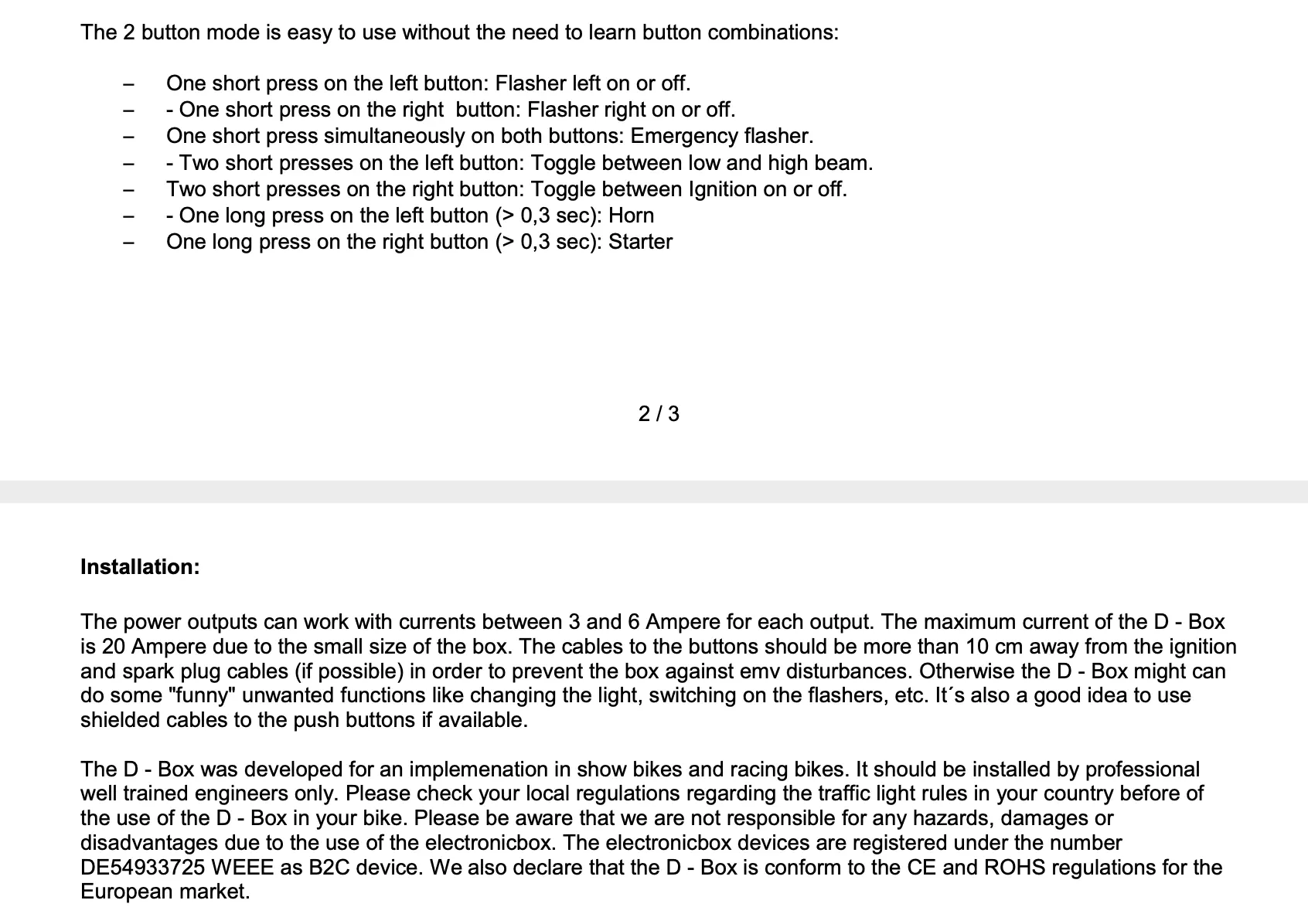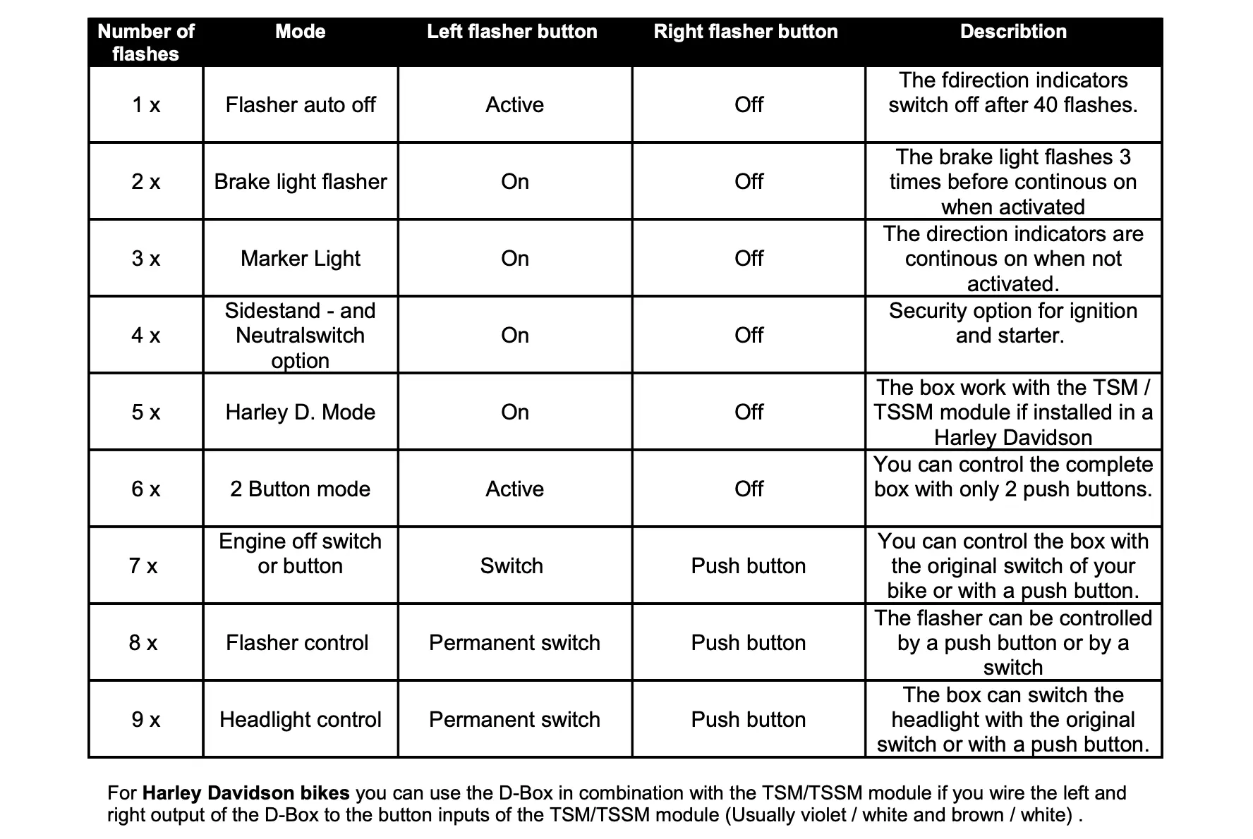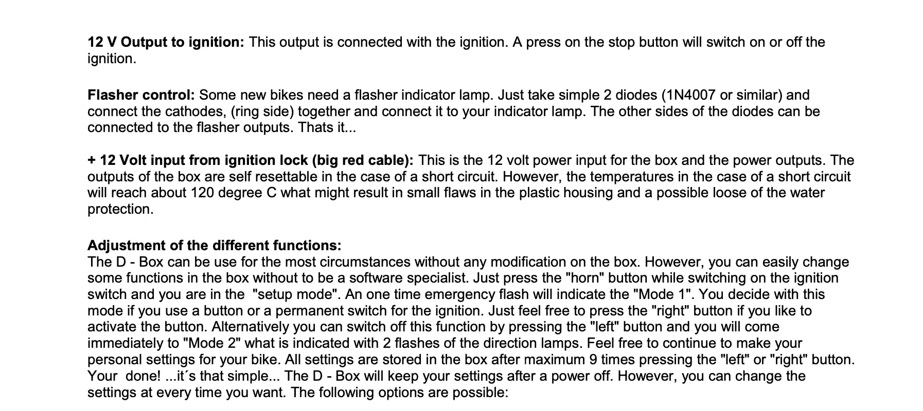 This electronic box version D controls the main functions of your motorbike in combinations with push buttons. The following options are possible: