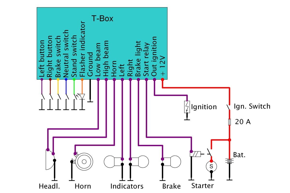 It took me a bit time to think how to develope a control box with just 2 button inputs for the control of all main functions of a bike. The result is the T-Box ("T" stands for tricky). The T-Box controlls the main functions of your motorbike in combinations with just 2 push buttons. The following options are integrated: