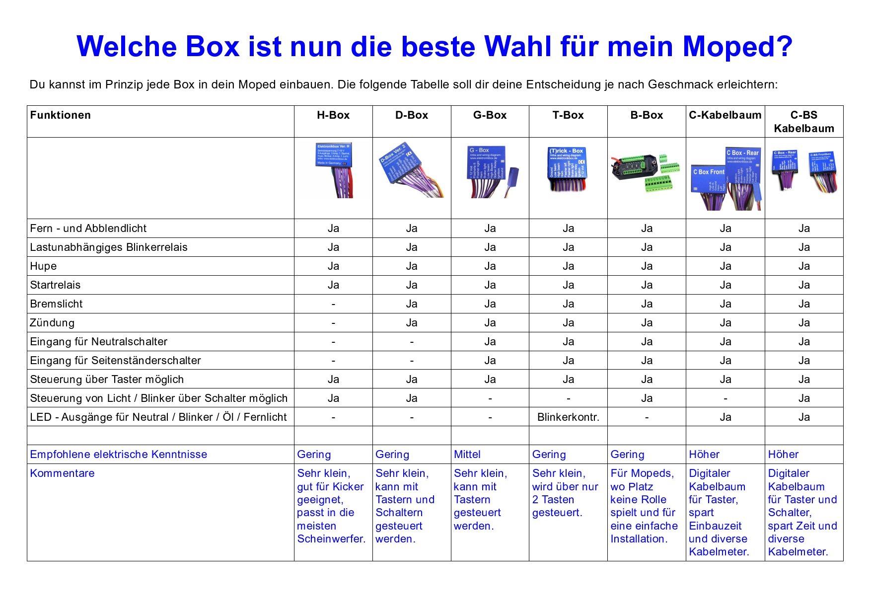 The several functions are user programmable and can be changed at every time. Just press the left button while switching on the power to the T-Box and your are in the "program" mode. A one time emergancy flash will indicate the program mode. A press on the right or left indicator button will switch on or off a small showflasher function. A press at one of the buttons will switch to the second program option. So, you can easily program your own setting with a few steps. For further infos, just feel free to take a look to the manual.