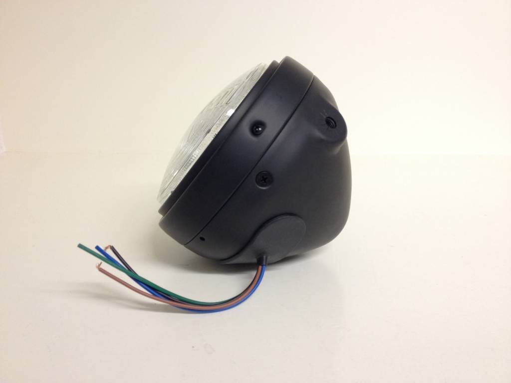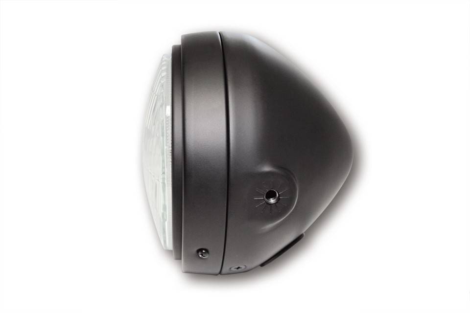 Headlight with parking light and an adjustable inner ring, matte black metal housing, H4 12V 60/55 W, side mount, E-marked. Dimensions: Case diameter: 165 mm, total depth including curved glass: 145 mm, lateral recording M8. Housing depth of mid-side mounting holes to the rear, about 75 mm.