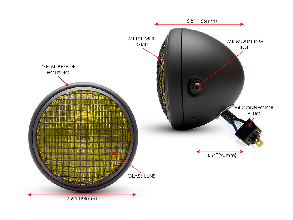 High-quality classic style side-mount headlight featuring a yellow semi sealed headlight, halogen bulb and a full metal housing. This headlight will suit fussy buyers who are looking for a quality product.