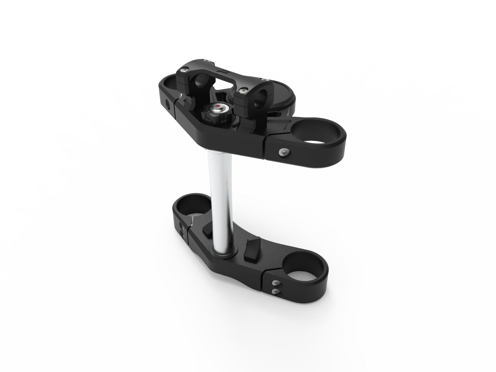 • Piastra forcella interamente in alluminio anodizzato nero con fermi sterzo regolabili e attacco per sdoppiatore linea freno